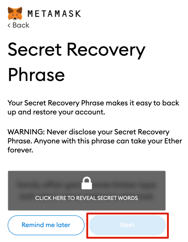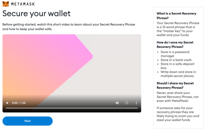 6. Before getting started, you need to backup your wallet’s seed phrase. The best practice is to write this seed phrase down and store it in a safe place like a safe deposit box. You don't want to store this digitally in a note or email where someone could get access to it. This seed phrase is what allows you to restore your wallet if you lose access to your device or forget your password. Obviously you do not want anyone else to see this phrase, as they can get control of your wallet and access all your funds and NFTs, if they have this phrase. If you aren’t familiar with how a crypto wallet works, make sure to watch the video and read the information. When you are ready, click [Next].